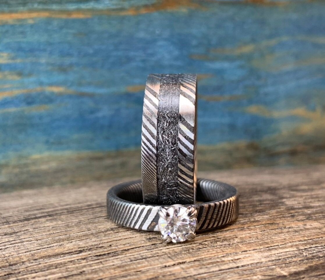 Matching Damascus Steel Ring Set Wedding Bands Genuine Craftsmanship Stonebrook Jewelry